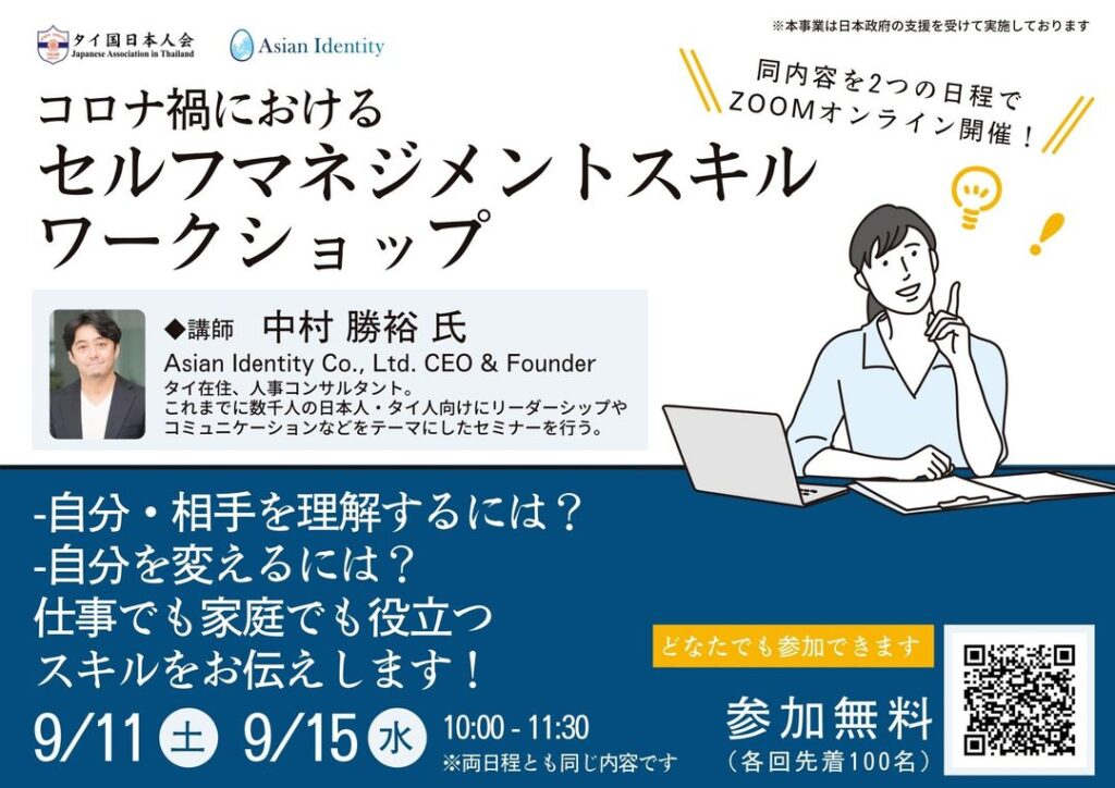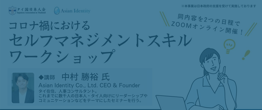 In collaboration with Japanese Association in Thailand, on 11th and 15th September 2021, Asian Identity’s CEO and founder, Mr. Nakamura Katsuhiro, held an online workshop on the topic of ‘Self-management Skills during Covid-19 era’.