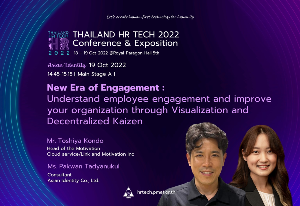 Moreover, Mr. Toshiya Kondo, Head of the Motivation Cloud service from Link and Motivation Inc., and Ms. Pakwan Tadyanukul, consultant from Asian Identity, will be giving a keynote speech on the topic of “New Era of Engagement: Understand employee engagement and improve your organization through Visualization and Decentralized Kaizen”.