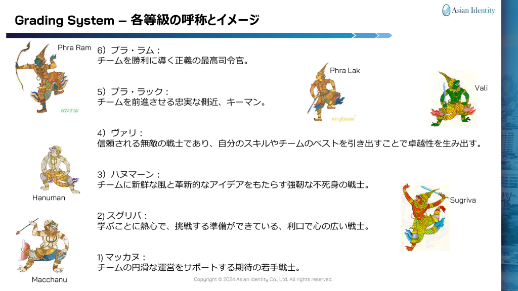 タイの神話をヒントにしたものですが、タイらしいストーリーがあり、また会社としてのアイデンティティも感じられるものだと思い、私は気に入って採用しました。以降、弊社では長年にわたってこの等級制度が運用されています。各等級に求められる具体的な能力はもう少し詳細な定義がありますが、新入社員にも記憶に残りやすい形で等級の構造を明示することができていると思います。これは少々ユニークな例かもしれませんが、わかりやすいイメージにするという参考として捉えて頂ければ幸いです。