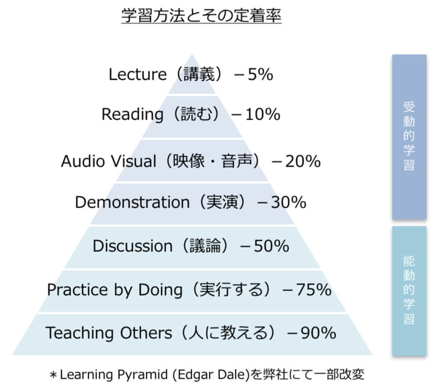 最も効果的な学びかたは、「人に教える」ことです。研修を行ったらそれをチームに 持ち帰って後輩の指導をさせる、等をすることです。そうした業務と接続された能動的な学習プロセスを作っていくと、研修が研修で終わらない効果を生みます。