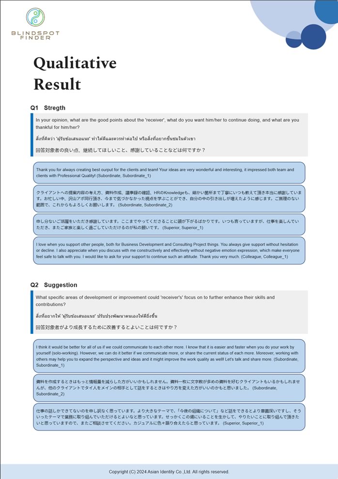 本ツールでは、定量・定性のアンケートをカスタマイズでき、各参加者には要点をまとめた個別レポートが提供されます。