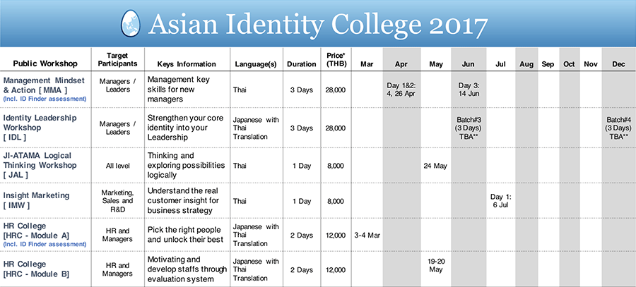 Asian Identity ได้รวบรวมเวิร์คชอบท่ีตอบโจทย์ปัญหาและความต้องการจากองค์กรต่าง ๆ มาเปิดเป็น Public Workshop Series ภายใต้ ชื่อ Asian Identity College 2017 เปิดให้ผู้สนใจ หรือองค์กรต่าง ๆ มาร่วมเรียนรู้ ฝึกฝน และแชร์ประสบการณ์ร่วมกันถึง 5 หลักสูตรหลัก ไม่ว่าจะเป็นการบริหารจัดการคน การคิดวางแผนและประมาณการอย่างมีหลักการ กลยุทธ์การตลาด นอกจากนี้ เรายังได้เปิดหลักสูตรใหม่ คือ “ติวเข้มคน HR (HR College)” รวมทุ กองค์ความรู้และแนวคิดที่ HR ทุกคนต้องมีสําหรับการขับเคลื่อนองค์กรให้เติบโตอย่างมี เสถียรภาพ และที่พิเศษท่ีสุด ในปีนี้เราจัด Identity Leadership Workshop หรือการสร้างภาวะความเป็นผู้นํา โดยเริ่มจากตัวตนของคุณเอง ถึงสองรุ่นในปีนี้