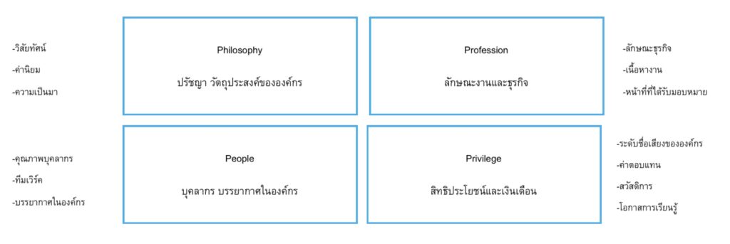 ประการที่ 1 คือ “Philosophy” กล่าวคือ “ความดึงดูดด้านปรัชญาและวัตถุประสงค์ขององค์กร” ถ้ารู้สึกว่าวิสัยทัศน์ของบริษัทน่าสนใจ คนก็จะเลือกทำงานที่นั่น บางครั้งก็จะมองข้ามเรื่องขนาดองค์กรเลย เช่น บริษัท Startup ซึ่งมุ่งมั่น “สร้างสรรค์สิ่งที่ไม่เคยมีมาก่อน” ก็สามารถทำให้คนรู้สึกตื่นเต้นและสนใจได้ หรือบริษัทขนาดใหญ่หลายแห่งก็เน้นสื่อสารด้านการอุทิศตนเพื่อสังคม และดึงดูดคนเก่ง ๆ จำนวนไม่น้อยเข้าร่วมงาน