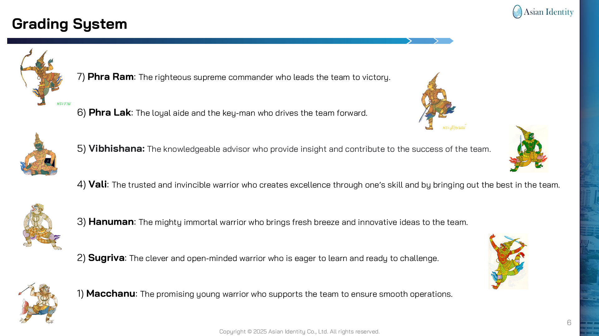 ระบบตำแหน่งงานของ Asian Identity ที่ใช้กันมานานนั้นมีแรงบันดาลใจมาจากวรรณกรรมเรื่องรามเกียรติ์ ผมตัดสินใจเลือกใช้ไอเดียนี้เพราะชอบที่มันสะท้อนวัฒนธรรมไทยแถมยังแสดงให้เห็นถึงอัตลักษณ์บริษัทครับ